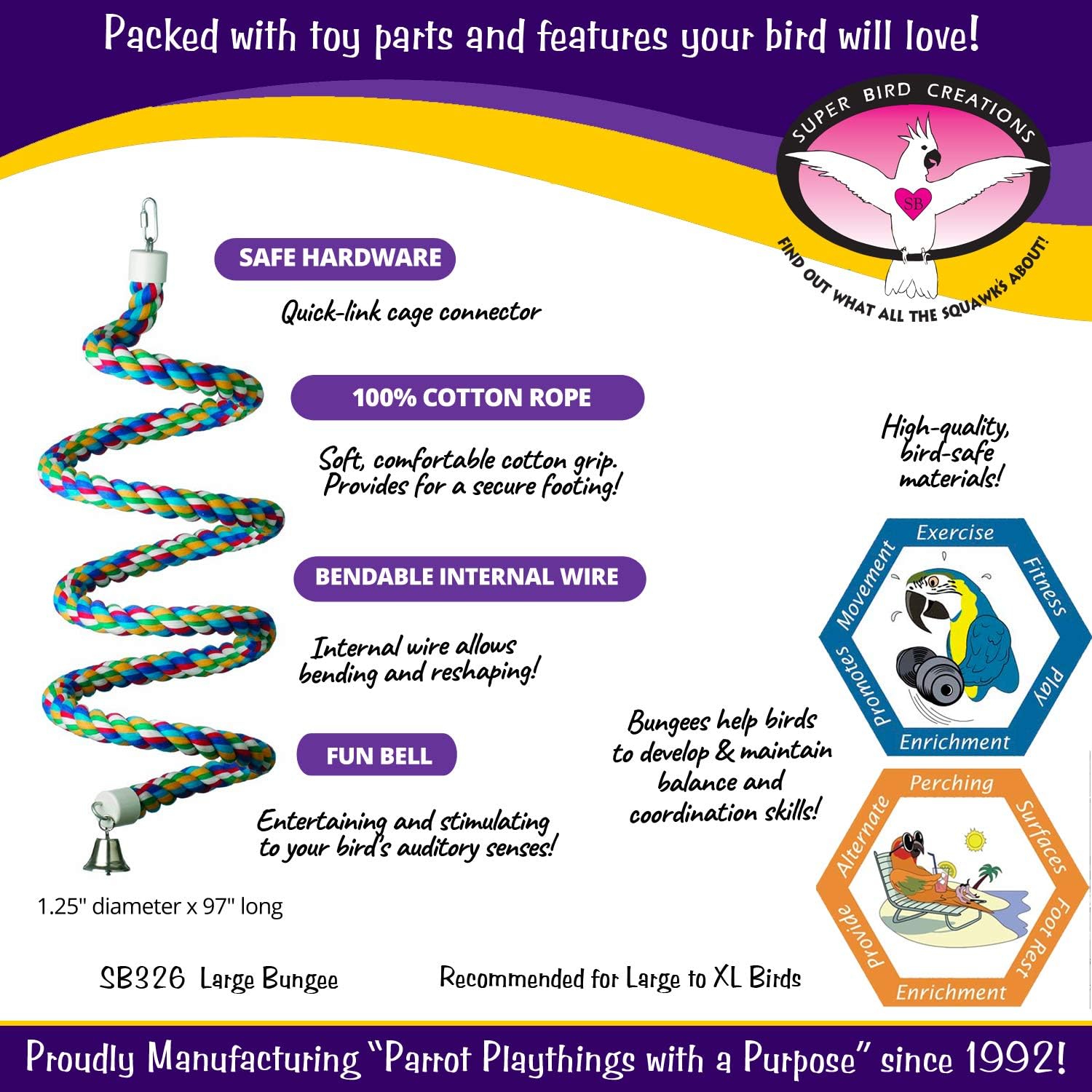 Super Bird Creations - SB326 Large to XL Bungee Bird Toy - Rope Perch for Amazons, African Greys, Cockatoos, Parrots - Colorful Hanging Perch - Enriching Bungee Toy for Large/XL Birds & in Bird Cages