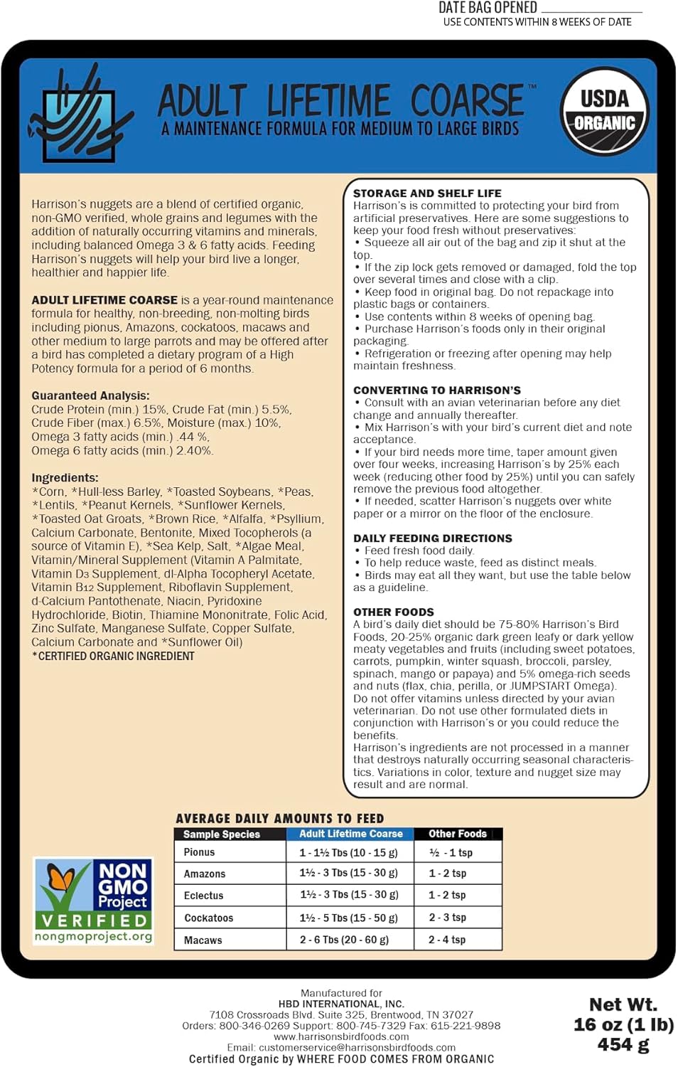 - ADULT LIFETIME COARSE is a year-round maintenance formula for healthy, non-breeding, non-molting birds including pionus, Amazons, cockatoos, macaws and other medium to large parrots and may be offered after a bird has completed a dietary program of a High Potency formula for a period of 6 months. Harrison’s nuggets are a blend of certified organic, non-GMO verified, whole grains and legumes with the addition of naturally occurring vitamins and minerals, including balanced Omega 3 & 6 fatty acids. Feeding Harrison’s nuggets will help your bird live a longer, healthier and happier life.