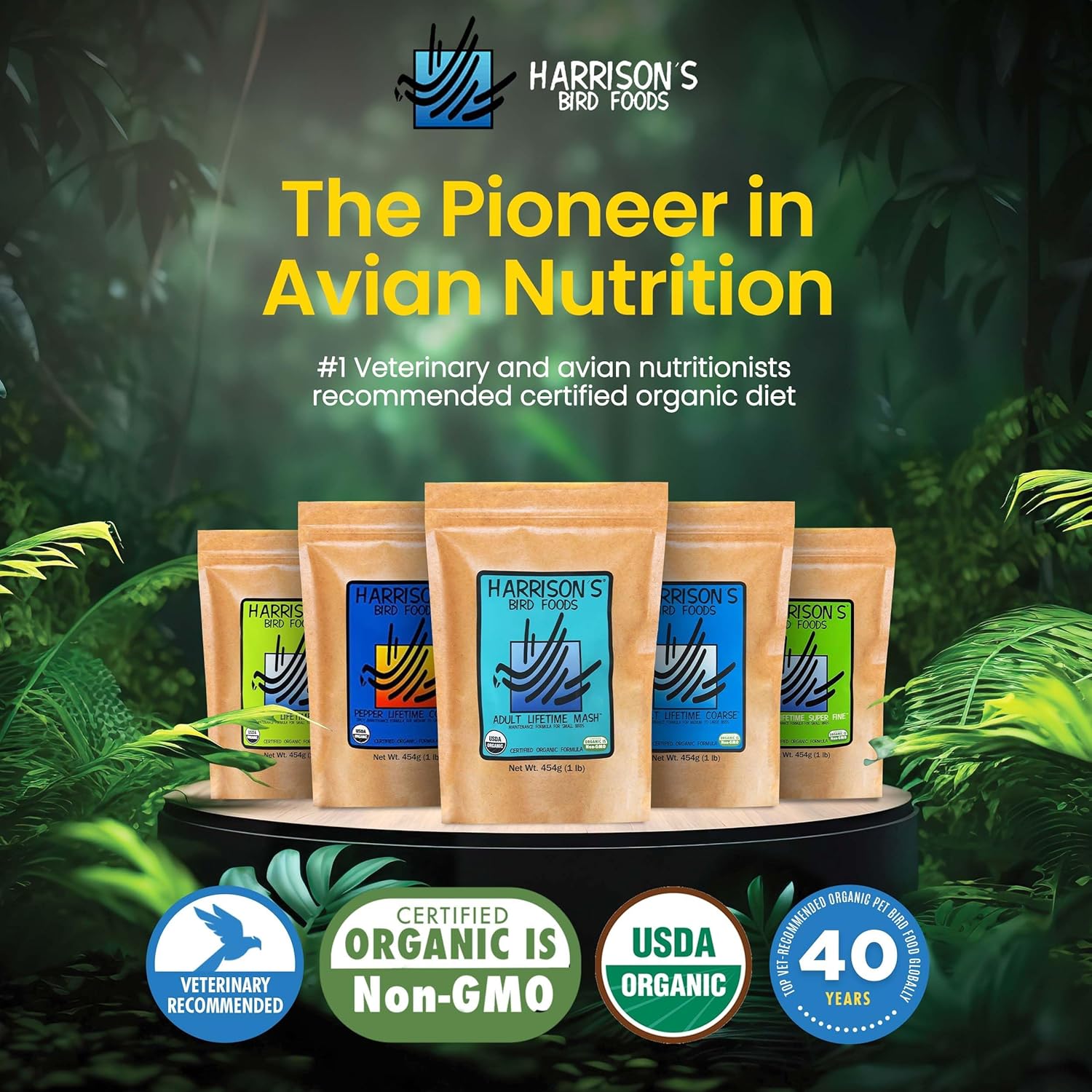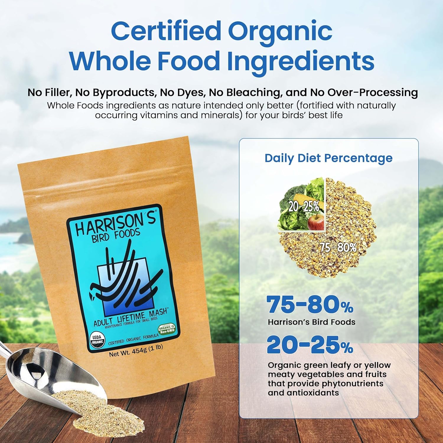- HUMAN QUALITY INGREDIENTS, NO BLEACHING, DYING, OR OVER PROCESSING: We prioritize your bird's health by using only certified organic, whole food human-grade ingredients with the perfect addition of naturally occurring vitamins and minerals for a complete, balanced diet. All the nutrition your birds needs, without toxic pesticides, fungicides, and herbicides. A food that will make your bird feel good, and that you can feel good about feeding.