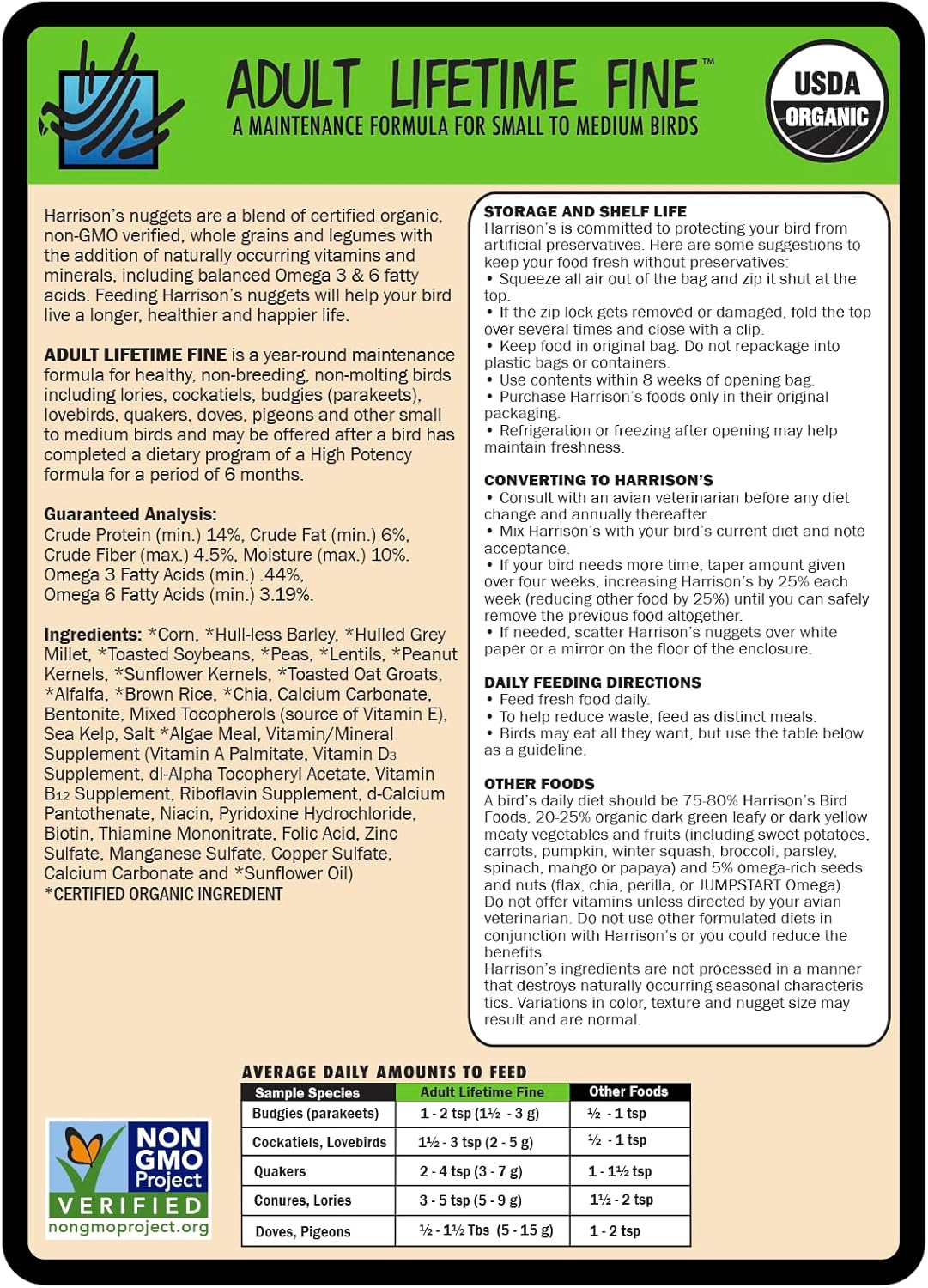 - ADULT LIFETIME FINE is a year-round maintenance formula for healthy, non-breeding, non-molting birds including lories, cockatiels, lovebirds, quakers, doves, pigeons and other small to medium birds and may be offered after a bird has completed a dietary program of a High Potency formula for a period of 6 months.