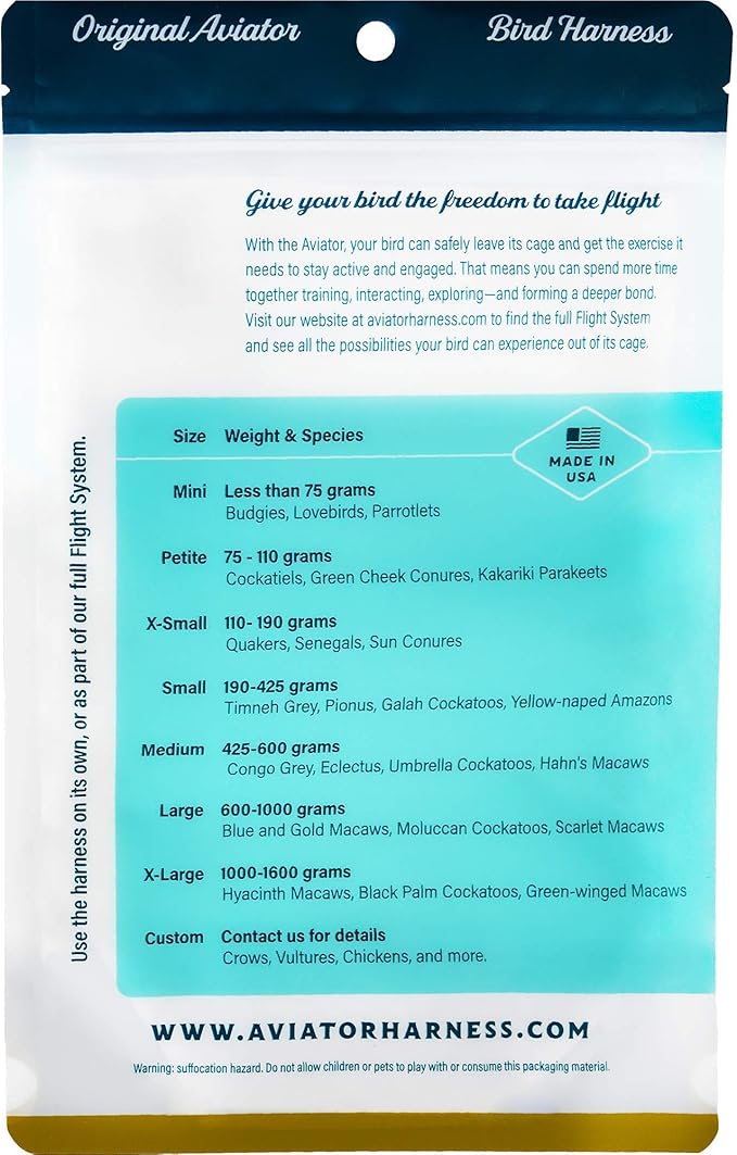- Self-adjusting Elastic Leash: Automatically adjusts from the chest to the back as the bird climbs and flies and eliminates a SUDDEN IMPACT when he fly's to the end. Efficient design has fewer pressure contact points on your bird. The special design is very useful for free flight training. The Aviator is not a bird diaper or flight suit.