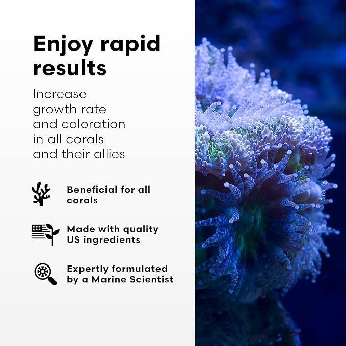 - BOOST COLOR VIBRANCY – Widely used by professional coral farmers to enhance the coloration in all corals. A coral food that will act as the building block of protein for corals, filling in nutritional gaps for a healthier, more vibrant coral coloration in the reef aquarium and accelerated growth rates