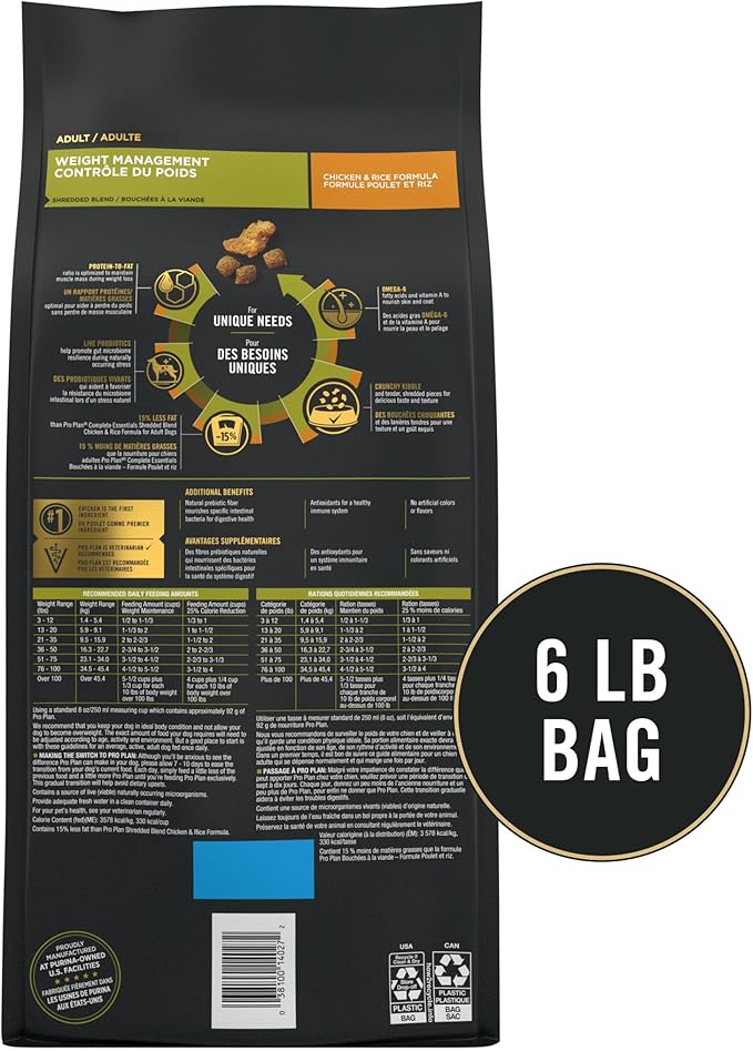 Purina Pro Plan Weight Management Dog Food Dry, Shredded Blend Chicken and Rice Formula - 6 lb. Bag