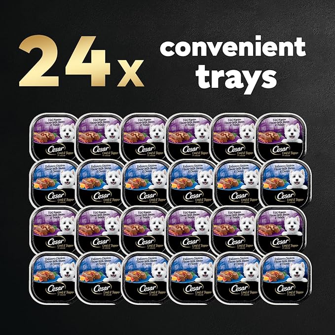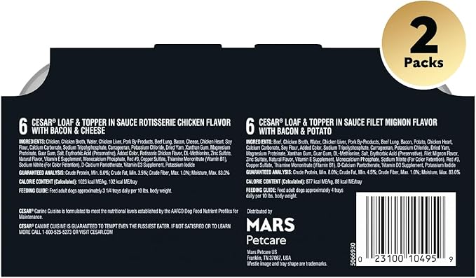 Cesar Wet Dog Food Loaf in Sauce Rotisserie Chicken Flavor with Bacon & Cheese and Filet Mignon Flavor with Bacon & Potato Variety Pack, 3.5 oz. Easy Peel Trays (12 Count, Pack of 2)