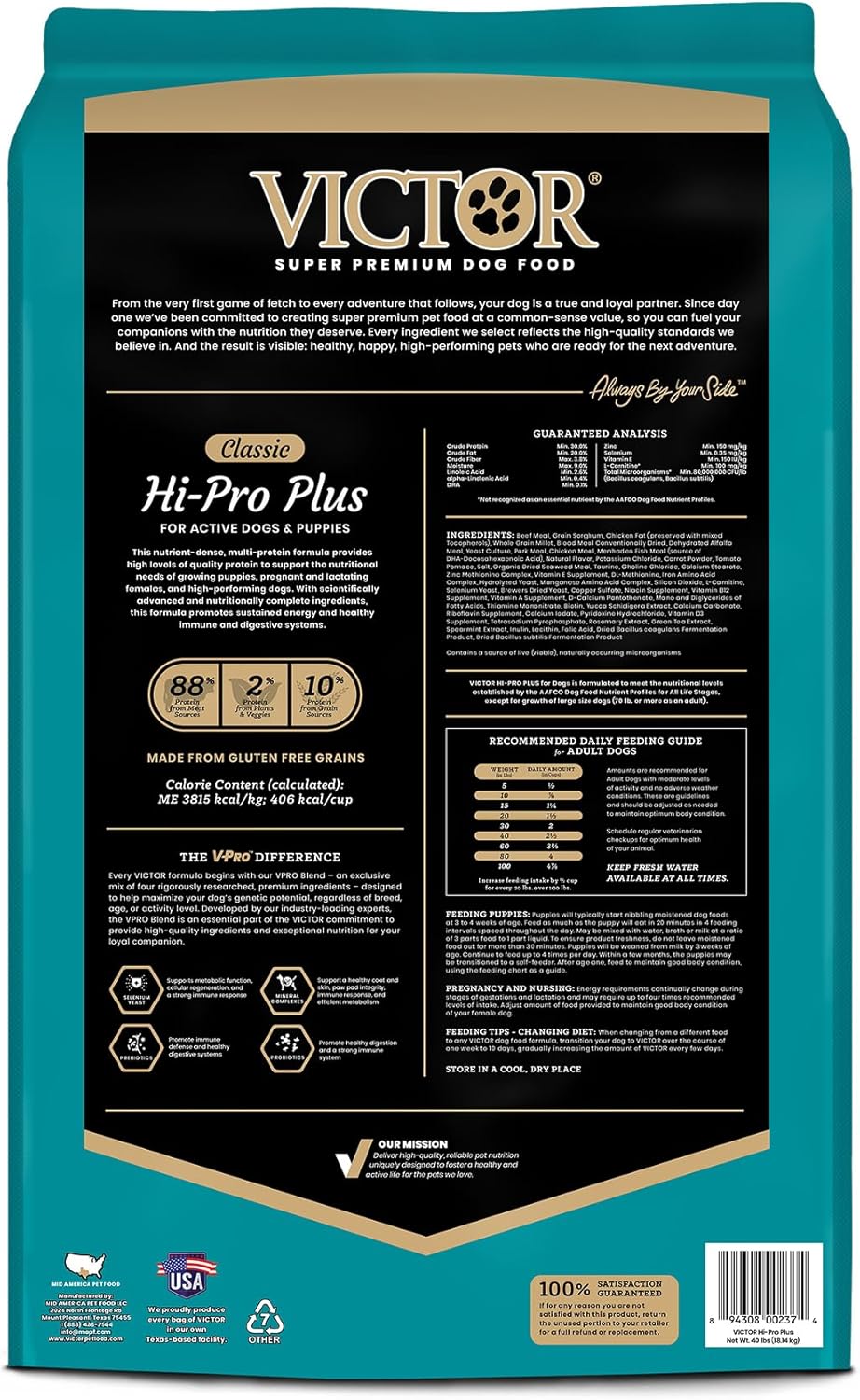 - HIGH PROTEIN DOG FOOD: Packed with premium-quality beef, chicken, pork and fish meals; With 30% protein and 20% fat, it provides young dogs and mothers with key nutrients for healthy growth and vitality, making VICTOR Hi-Pro Plus a reliable choice