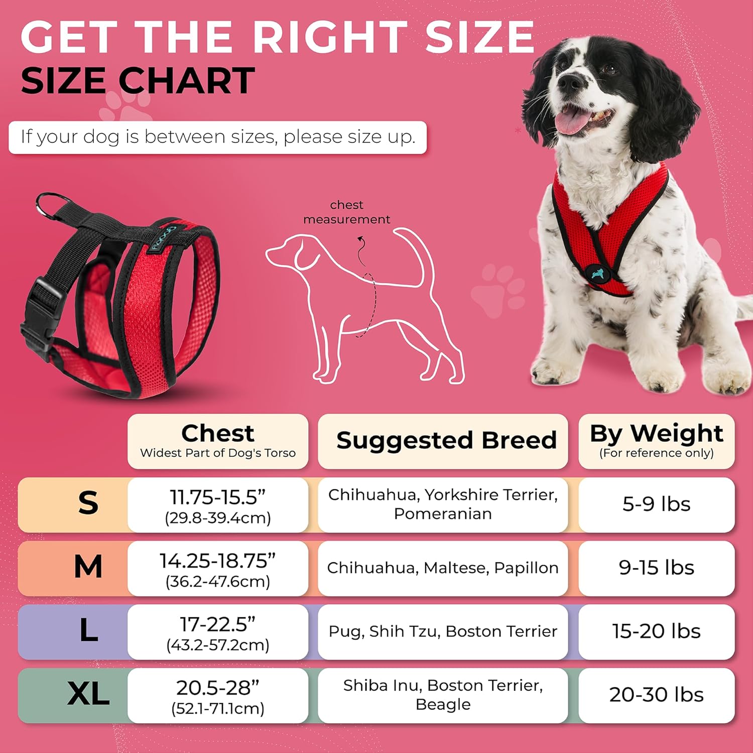 - Leash Attachment - High quality metal d-ring for extra security to withstand the test of time. [Note: When choosing the correct size, we recommend measuring the largest part of the dog's chest and follow the chest sizing first and foremost. If between sizes, please size up]