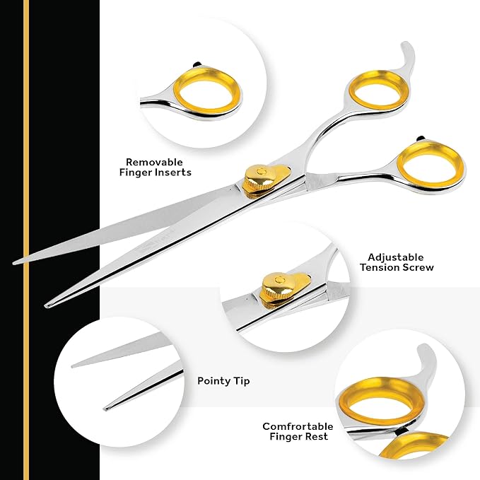 - ⍟ DISTINCTIVE SHARPNESS WITH SUPERIOR PRECISION: Made of 440c Japanese stainless steel, the sharp blades are alloyed and enhanced with an adjustable tension knob for amazing precision. These 8.5" dog grooming shears also use a beveled edge blade for amazing durability, strength, and easy resharpening after long use.