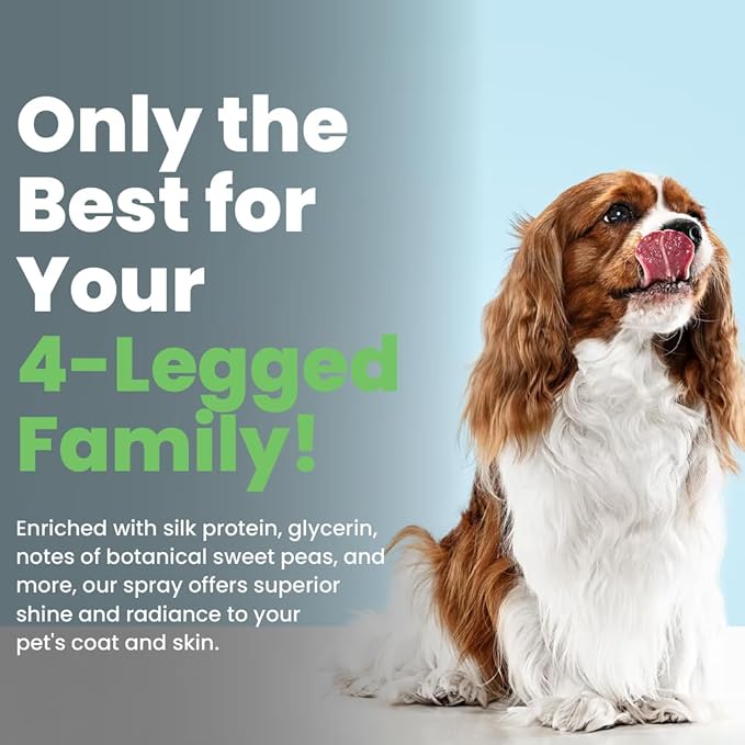 - Carefully Crafted: Enriched with essential ingredients like silk protein and glycerin along with the notes of botanical sweet peas, our pet grooming spray offers superior shine and radiance to your pet's soft coat and fur.
