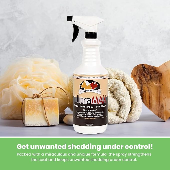 - Versatile Spray Bottle: Best Shot UltraMAX Pro Finishing Spray is packed with a miraculous and unique formula that strengthens the coat and keeps unwanted shedding under control. Our spray is suitable for dogs, cats, puppies, and kittens.