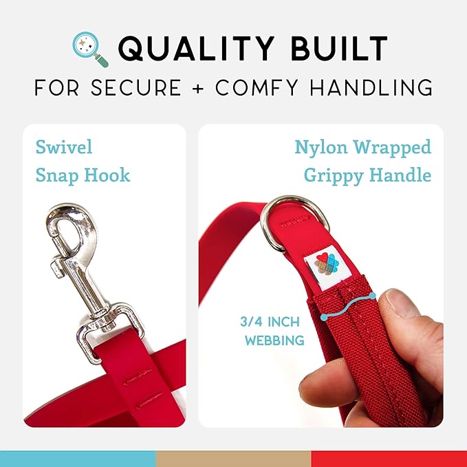 - Grippy Reinforced Handle: 1000D nylon-wrapped handle tastefully adds texture and grip to this sleek waterproof dog leash. It includes a D-ring for attaching accessories such as our Funston Baggie Poop Bag Holder, adding to its practicality and convenience.