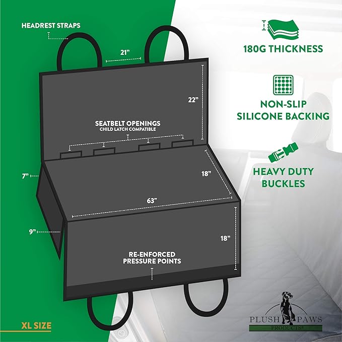 - πππ¦π¬ π§π’ ππ‘π¦π§πππ: Our sizes options are SMALL - 50"W X 60"L, REGULAR - 55''W X 58''L, LARGE, EXTRA LARGE - 65''W X 63''L, and all have 9'' X 18'' SIDE FLAPS. This elastic skirt and adjustable back and headrest straps provide a seamless clean look and snug fit. Buckle the dog car seat protector to your back seat using the adjustable back strap and insert the seat anchors to secure the cover in place. The headrest strap fits most vehicles.