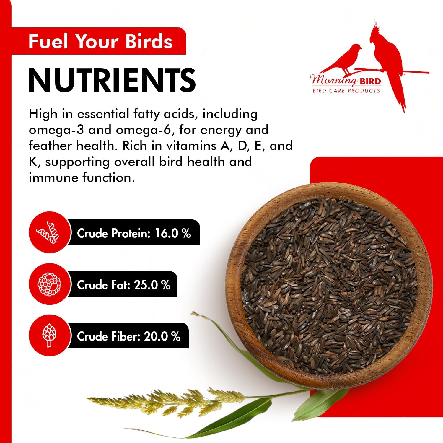 - Packed with Essential Nutrition: Packed with 16% protein and 25% fat, Morning Bird Nyjer Seed offers essential nutrients for energy-demanding seasons like breeding or molting. This high-protein seed helps maintain overall health, vitality, and feather quality.