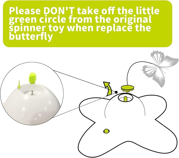 - 6 Butterfly Refills: The six replacement butterflies are designed for our All for Paws Interactive Cat Butterfly Spinner Toy , Please DON'T take off the little green circle from the original spinner toy when replace the butterfly.