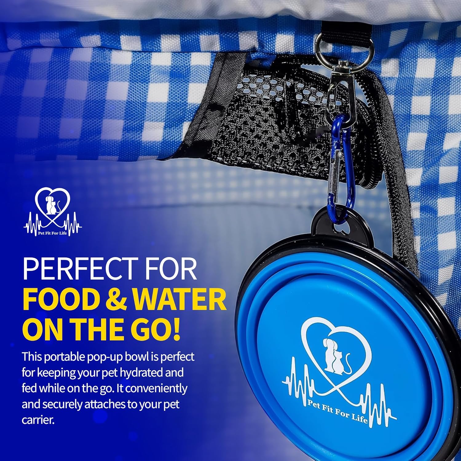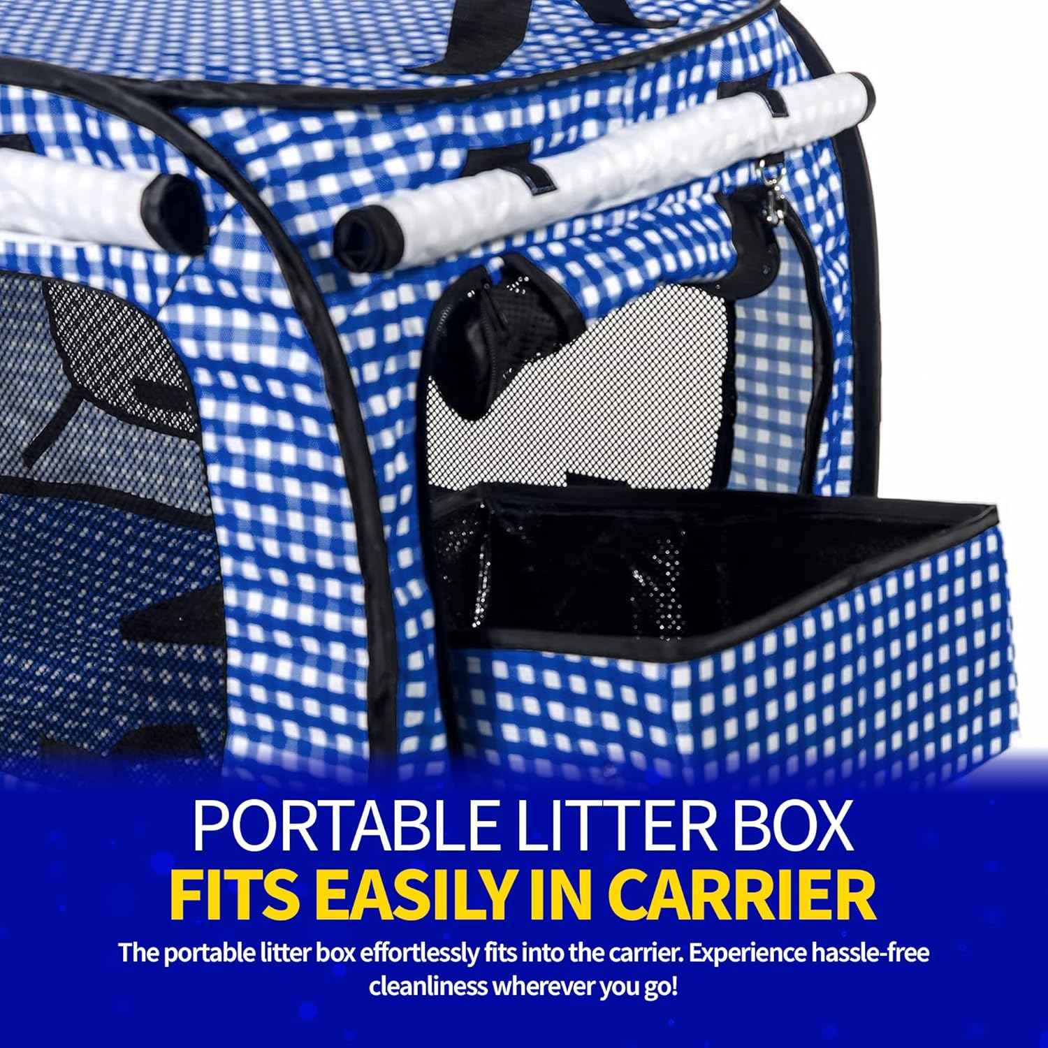 Pet Fit For Life Extra Large Cat Carrier for Travel - Foldable & Portable Collapsible Kennel with Litter Box, Feather Toy & Water/Food Bowl - Ideal for Cars, Long Trips & Indoor Cats - Blue Checkers