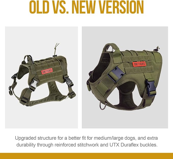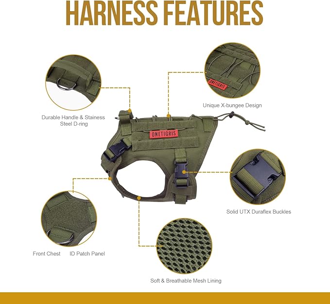 - MOLLE System & Military Style: Each side features two MOLLE straps as well as hoop & loop strips panel to easily attach molle pouches or ID panels; OneTigris harness is not designed to bear heavy weights and we advise against relying solely on the grab handle to carry your dog