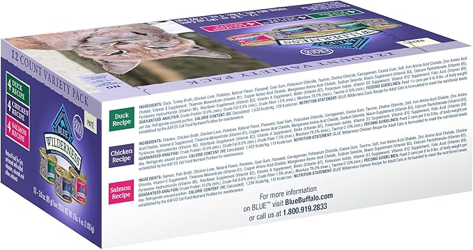 - Contains One (1) Variety Pack of BLUE Wilderness High Protein Grain Free, Natural Adult Pate Wet Cat Food, Chicken, Salmon, Duck 3-oz (12 count- 4 of each flavor)