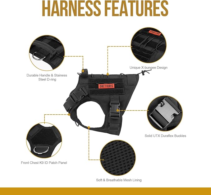 - MOLLE System & Military Style: Each side features two MOLLE straps as well as hoop & loop strips panel to easily attach molle pouches or ID panels; OneTigris harness is not designed to bear heavy weights and we advise against relying solely on the grab handle to carry your dog