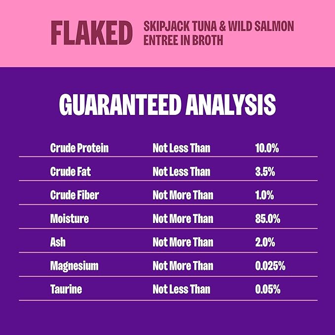 - FLAKED TUNA AND SALMON: All-natural wet food delivers what your cat craves. Protein-rich recipe features delicate flakes of tuna and salmon in a delicious broth that supports daily hydration. We recommend serving at room temperature for maximum palatability.