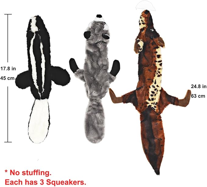 - 3 No stuffing toy (racoon, wolf, skunk) include 3 squeakers each 2 Animal Plush toy: a monkey and a duck goose plush toy