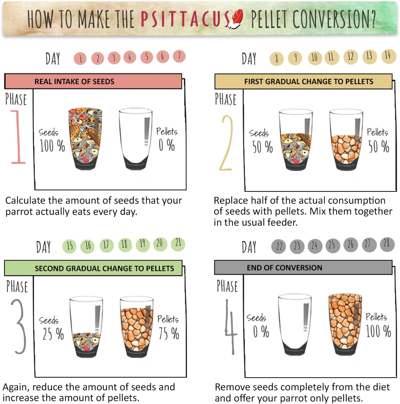 - PSITTACUS HIGH ENERGY: It is an extruded pellet designed for species that in nature consume high fat diets such as the African grey parrot (yaco), macaws and other types of African parrots. It's suitable for young and adult birds. It comes in a 6.6 lb package.