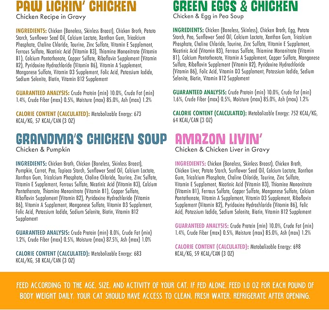 - Variety Pack includes 6 cans of each: Paw Lickin’ Chicken, Green Eggs & Chicken, Grandma’s Chicken Soup and Nine Liver.