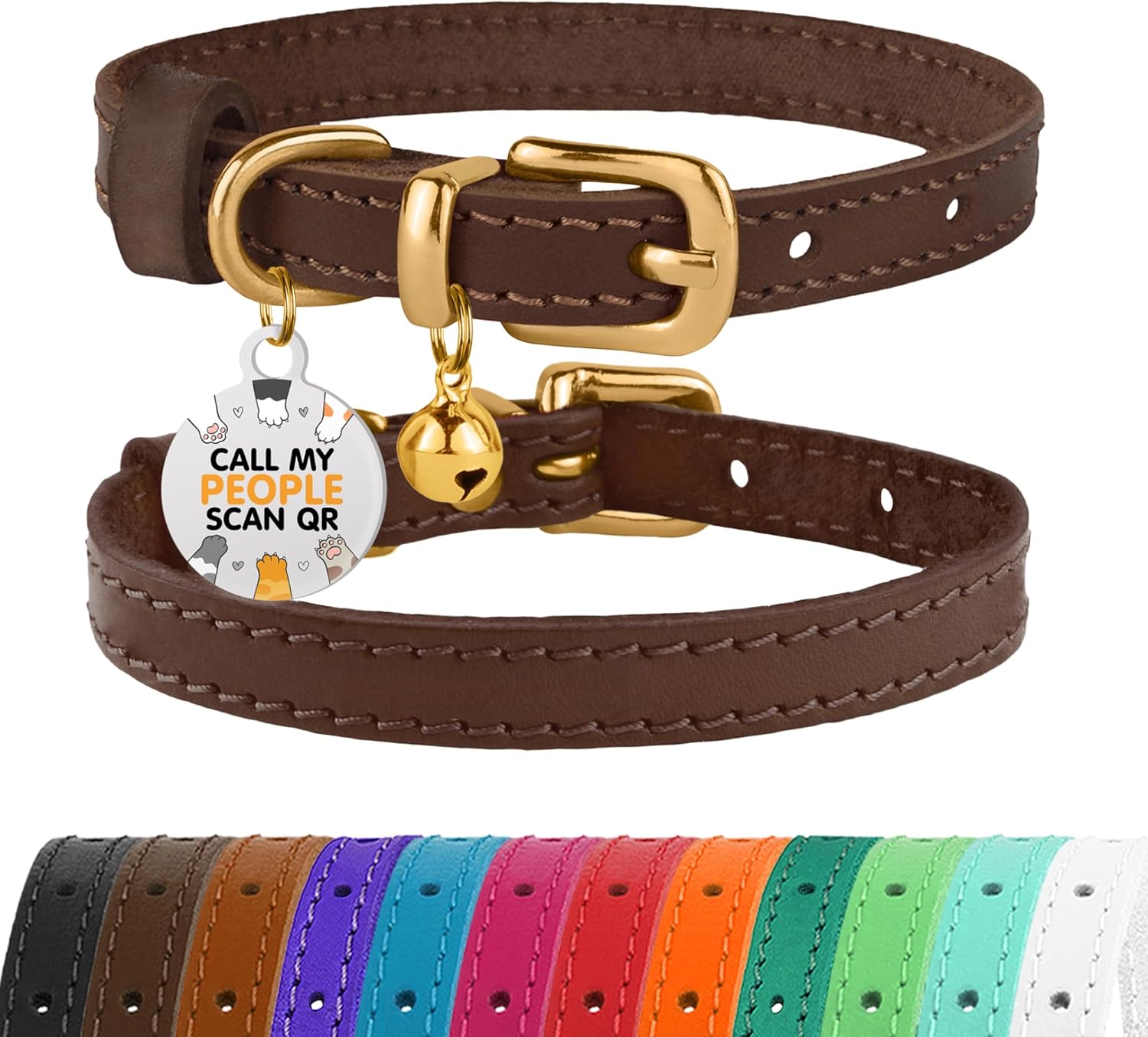 BRONZEDOG Leather Cat Collar with Removable Bells Non Breakaway Kitten QR Tag for Girl Boy (7" - 9" for Cats, Dark Brown & Gold)