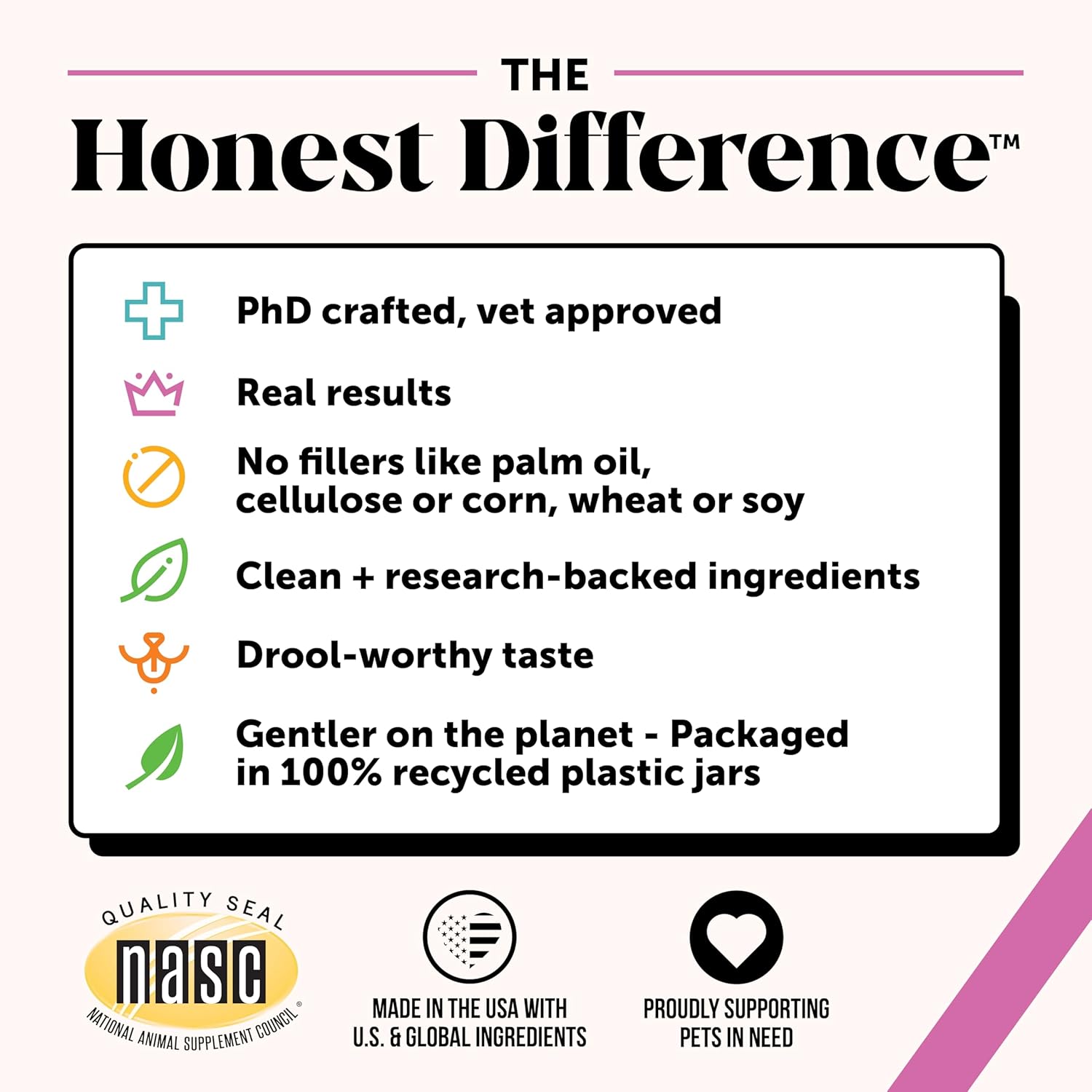 - Pet Honesty Pledge: A taste your pet will love & results you can trust. Made with the most effective natural + other premium ingredients. Formulated without corn, wheat, or soy. No artificial preservatives, colors, or flavors.