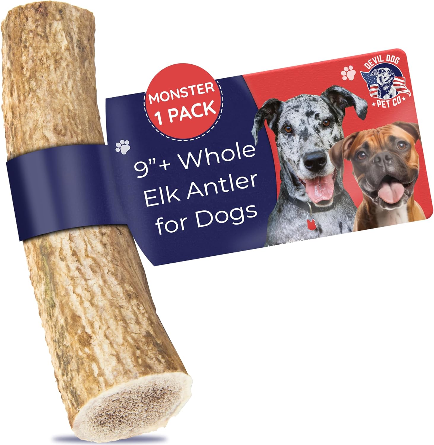 Devil Dog Pet Co. Elk Antlers for Dogs, Monster 9"+, 1 Pack, Grade A Long Lasting Chew for Aggressive Chewers, Premium USA Naturally Shed Antler – Healthy, No Odor, Durable Dog Chew