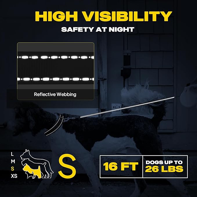 - HEAVY DUTY, DURABLE & STEADY - 16 ft high strength nylon tape with durable rustproof swivel hook and steady impact-resistant ABS material, suitable for Small and Medium dogs or cats up to 26 lbs. Top durability Internal Coil Spring for Consistent Retraction several years.