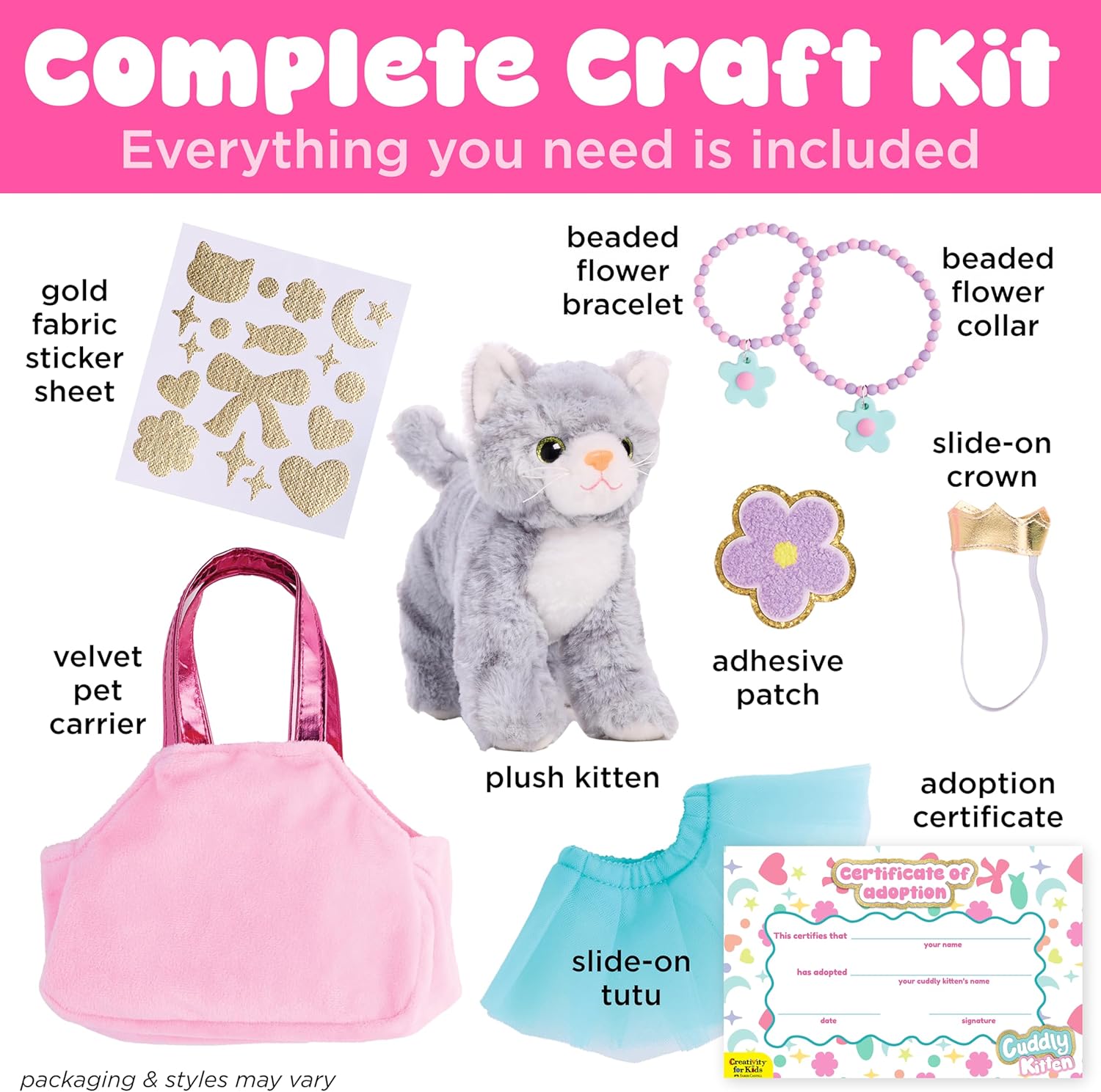 - PAWSITIVELY CREATIVE PLAYTIME: Pamper your plush pet with everything included in this fun and stylish craft kit! Inside you’ll find a soft gray stuffed kitten, pink velvet tote, tutu, gold crown, floral bead collar, glittery stickers, peel-and-stick patch, bracelet beads, and an adoption certificate. Enjoy a mix of sensory play, accessories, and fashion fun—it even doubles as a bracelet making kit