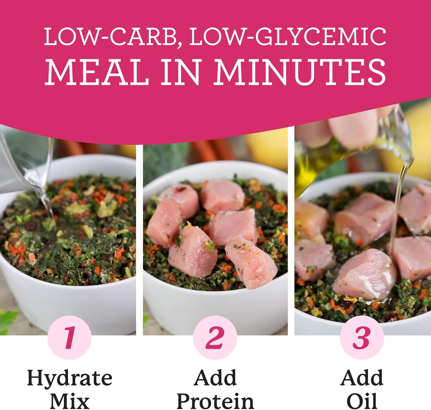 - Ready in minutes. Simply rehydrate the base mix with hot water, let sit for 8 minutes, and add the protein of your choice and a healthy oil of your choice for healthy fats. (Try our fish oil!)