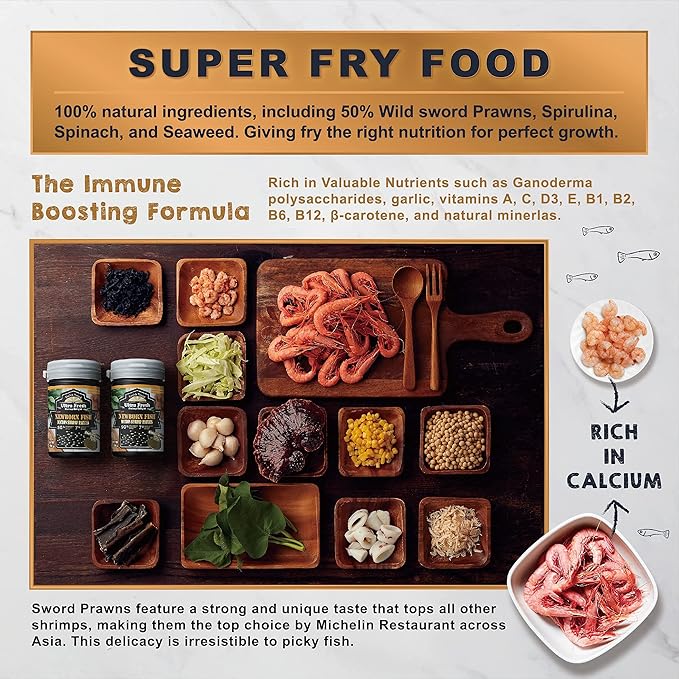 - Ultimate Growth Formula Contains up to 50% wild sword prawn & akiami paste shrimps with wealth variety of natural ingredients. Rich in calcium and fiber, while low in fat, this formula helps fry develop strong bones and healthy body.