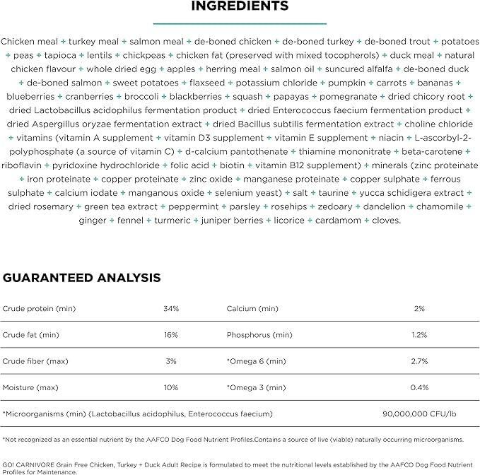 Go! Solutions Carnivore, Grain-Free, Protein Rich Dry Dog Food, Chicken, Turkey and Duck Adult Recipe, 3.5 lb Bag