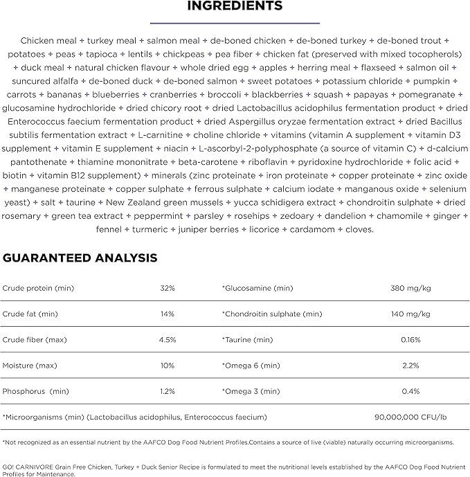 - PROTEIN-RICH FOOD TO SUPPORT STRONG, LEAN MUSCLES: The first six ingredients and 85% of the protein in our grain free CARNIVORE Chicken, Turkey + Duck Senior dog food comes from real premium-quality meat + fish.