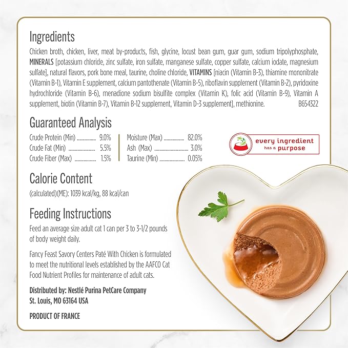 - COMPLETE AND BALANCED: With Chicken pate cat food with a gravy center makes mealtime exciting while delivering 100 percent complete and balanced adult nutrition.