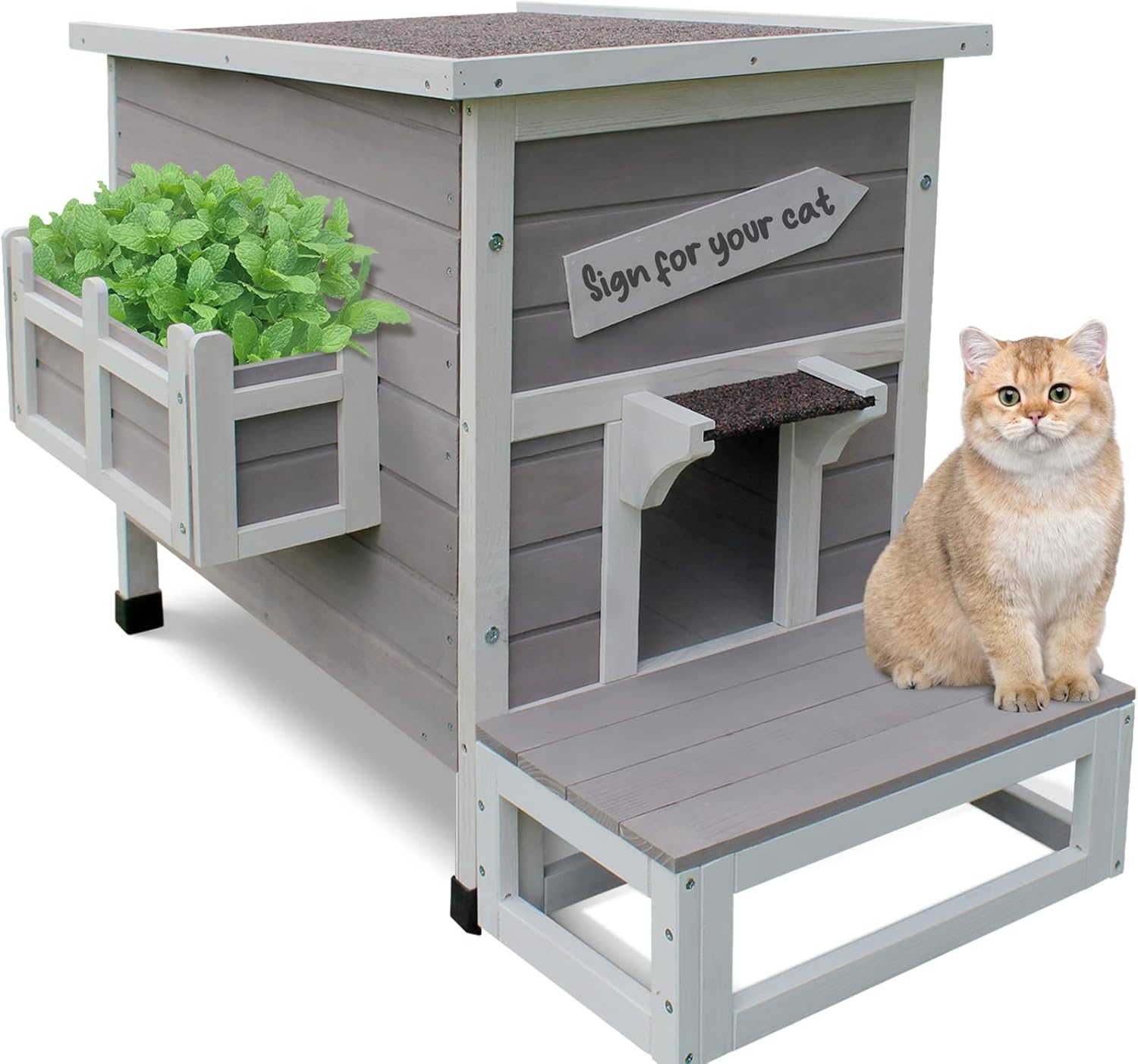 Rockever Outdoor Cat House, Large Outdoor Houses for Feral Cats Wooden Outside Cat Shelter Weatherproof with Escape Door