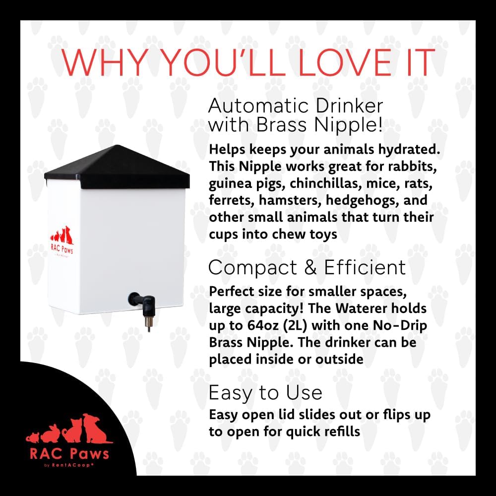 - Compact and Efficient: Perfect size for smaller spaces, large capacity! The Waterer holds up to 64oz(2L) with one No-Drip Brass Nozzle. Suitable for small animals such as rabbits, guinea pigs, chinchillas, ferrets, hamsters, hedgehogs, rats, mice and more