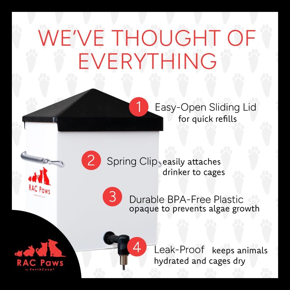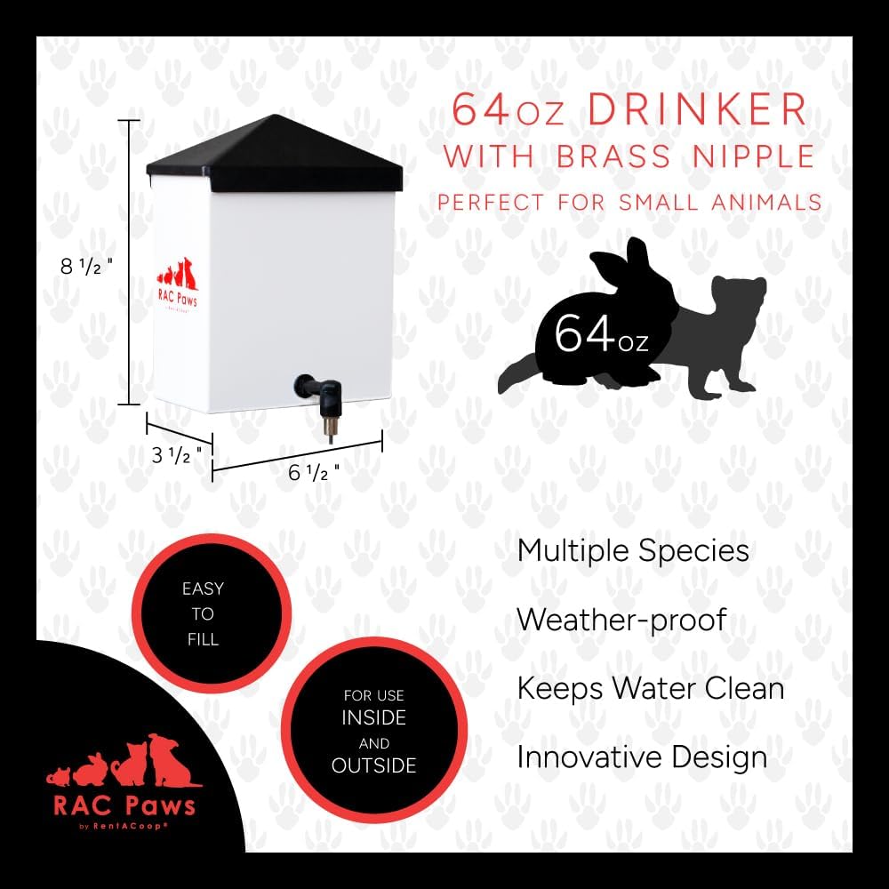 RentACoop 64oz(2L) Small Animal Drinker with No-Drip Brass Nozzle - Suitable for Small Pets, Bunnies, Hamsters, Guinea Pigs, Hedgehogs, Rabbits, Chinchillas, Mice and Rats