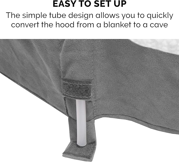 - DESIGNED FOR PETS: The pet bed comes with an attached blanket hood that can be used as is or converted into a tented burrowing cave with the included plastic tubing; either configuration provides a cozy and insulating nestling space for dogs and cats