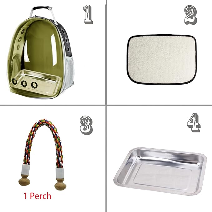 - Package includes 1 bird backpack + 1 stainless steel tray + 1 soft mat + 1 (ONE) cotton rope perch