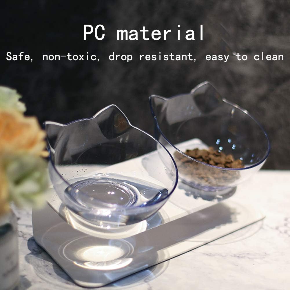 - 【DOUBLE BOWLS】The cat food and water bowl 2 in 1 in large oblique rim reduces cat food dropping and is suitable for flat-faced cats. Transparent bowls can control the amount of food, keep the pet health, and resist falling.
