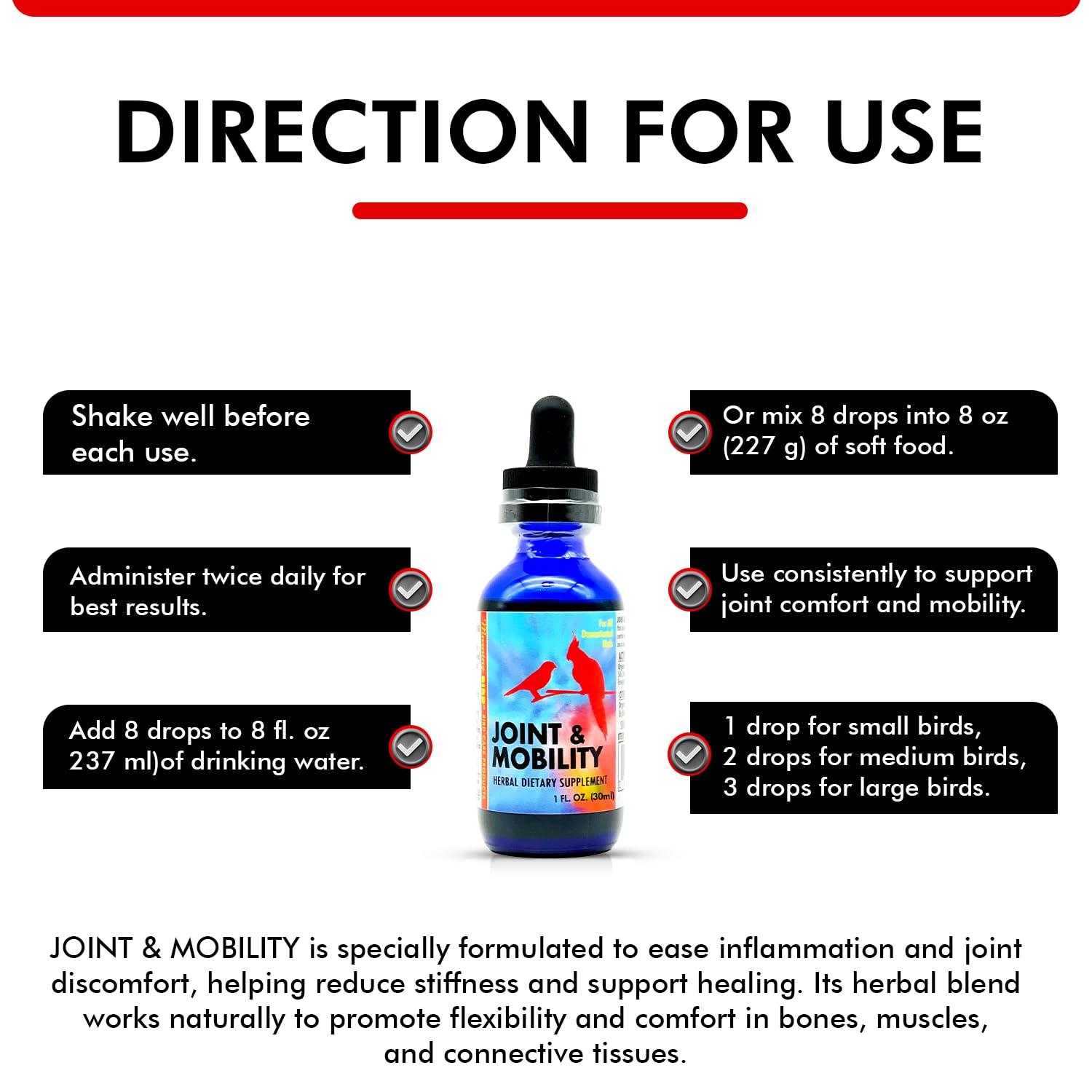 - Supports Joint Health & Everyday Movement: Give your bird the care they deserve with a formula that supports joint health and eases stiffness. Great for birds showing signs of joint pain or limited movement helps them stay active and comfortable every day.