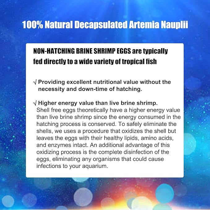 - HEALTHY & TASTY - Decapsulated brine shrimp eggs are super rich in protein, lipid, and amino acid! Their essential nutrients are key for all tropical fishes, especially for baby fishes.You will find positive effects in fish’s growth and behavior.