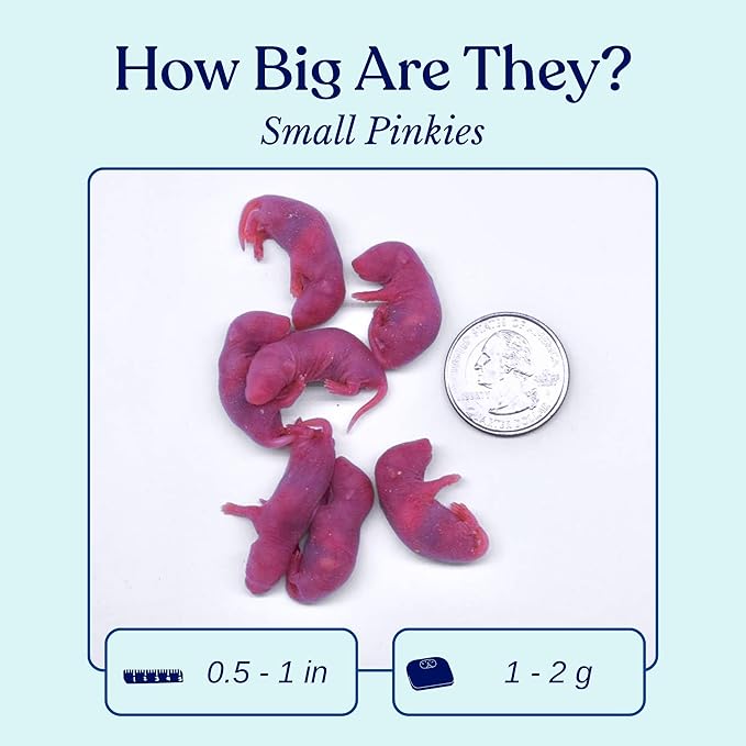 - Size; this frozen pack of 40 count frozen mice pinkies are .5-1 inches long not including the tail and 2-2.99 grams each