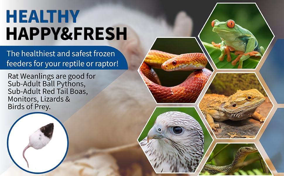 - HUMANE; This pack of 25 frozen Weanling Rats for snakes and reptiles has been produced under the most humane conditions; We only employ responsible staff who treat our feeder mice & rats with kindness and respect; Our feeder rats for snakes are put to sleep with Co2 so they never suffer