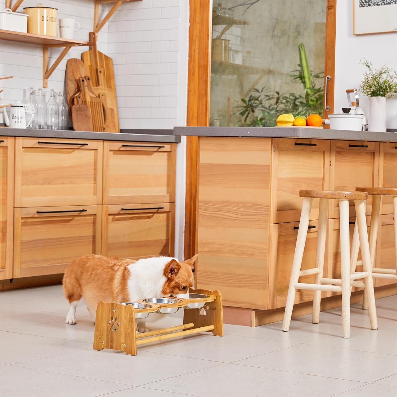 - Stable Anti-Skid: raised dog food bowls is made from Natural high quality bamboo.The dog feeding station with anti slip feet make it stable and does not slide easily, it prevent your pet from sliding bowls around and provide protection for your floors. Increases Anti-slip feet on bowl insets which eliminated the impact sound when pets are eating.