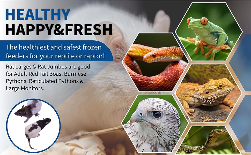 - Trusted; don’t risk inferior imported feeders from China or lab surplus for snakes and reptiles; these frozen pack of 7 rat larges and 7 rat jumbos are born in Cleveland Ga; there are no artificial ingredients or flavoring added