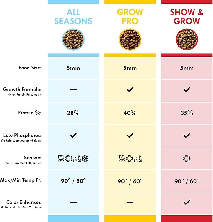 - All Seasons Nutrition For Vibrant Pond Life - Feed your fish with confidence year-round! This koi and goldfish food is expertly formulated with a 28% protein blend and fortified probiotics to support growth, energy, and immune health—no matter the season. Ideal for maintaining water clarity by reducing fish waste.