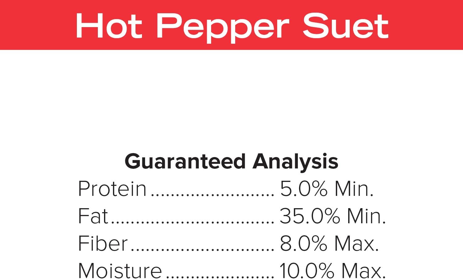 - Universal Appeal - Our no-melt hot pepper suet cake formula is perfect for year round feeding. Our suet cakes are designed to work with all suet feeders, so you can rest assured that all your birds will be well-fed and well-loved regardless of the time of the year or the style of your bird feeder.