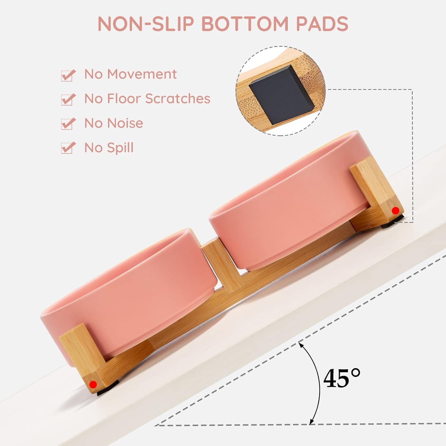 SPUNKYJUNKY Ceramic Dog and Cat Bowl with Wood Stand Non-Slip Matte Glaze Weighted Food Water Set for Cats &Small Dogs 13.5 OZ